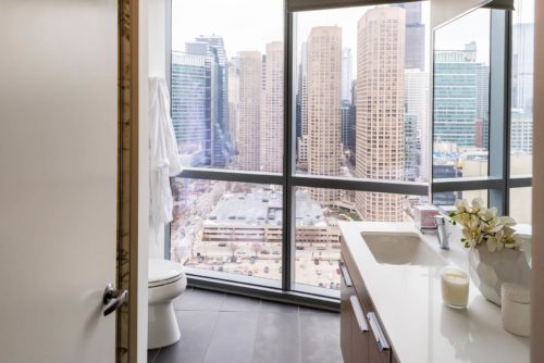 727 West Madison’s model apartments are located on the building’s 25th floor. They include a two-bedroom unit decorated by local firm Michael Richman Interiors with bold gray walls and geometric touches, a gold-accented studio apartment by Chicago’s Brianne Bishop Design, and a one-bedroom unit decked out in colorful patterns by Anthropologie.